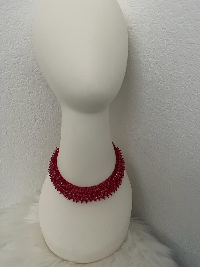 Beautiful necklace made by mexican artisan hands, made of chaquira and zirconia like stones, all in a beautiful red color, approximately 18 inches long and one inch wide.
